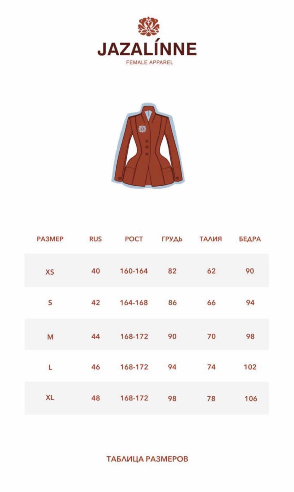 Рост 175 см; Бюст 85 см.; Талия 60 см.; Бёдра 92 см. На модели размер XS.